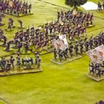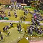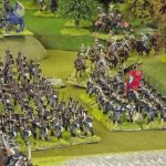 The rest of Sébastiani’s II Cavalry Corps – the 2nd Light Cavalry Division and the 4th Light Cavalry Division – were facing a nightmare of command-and-control in the confined space of the escarpment along the northern bank of the Neisse. The 2nd Light Cavalry had successfully made its way through the wooded defiles on to the plateau only to find their path blocked by Rochambeau’s 18th Infantry Division advancing across their path, whilst behind them Prussian Fusilier battalions were skirmishing in the woods and bring the stationary cavalry under a galling fire which they could do nothing about. Finally, half the division chanced its arm on feeding through a gap on Rochambeau’s right flank, only to fail to over-run an exposed Russian gun battery in a flank charge (the fifth or sixth time the Russians rolled 11 or 12 in a Charge Test that morning…). The 4th Light Cavalry Division fared even worse; stuck on the roads leading up from the Nieder-Krayn bridge they encountered Yorck’s Prussian Hussars under General Jürgass also in march column on the narrow valley road: round one went to the Lanciers du Ligne; round two to the Prussians, sending Exelman’s command reeling back across the Neisse and allowing Yorck’s Prussian foot to continue their remorseless advance right between the two wings of the French Army. MacDonald had clearly lost control of the battle, hampered by the terrain and some shocking lapses in command [French die rolling on the left flank was almost epically poor: 2 or 3 rolled in Charge or Discipline Test after Charge or Discipline Test].