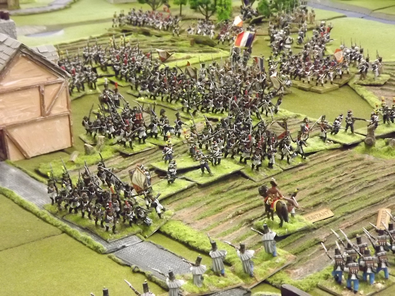 On the right flank Souham’s III Corps is also struggling. Some excellent shooting by the horse artillery attached to Beurmann’s Cavalry Division forced an Austrian battalion out of line but the opportunity to exploit the gap was lost as Brayer’s 8th Division chose that moment to temporarily lose its nerve [as a “Faltering” command due to the loss of a lead unit it failed its Command test – despite an ADC attachment – and rolled “Retire”]. Langeron has almost completed the ordering of his multiple lines of Austrian infantry and is looking confident. The 9th Division under Delmas is heading northeast for Schlauphof and its ford over the Neisse but a gap is opening behind as the 10th and 11th Divisions seem to take turns in failing to advance [one or both are often “Hesitant” and Souham cannot spare the ADCs to give them a re-roll]. The Badeners of Marchand’s 39th Division – originally intended as Souham’s “coup de grace” formation but now diverted to Nieder-Krayn to regain control of the bridge from Yorck’s Prussians – failed in their first assault. This leaves its column stuck on the bridge facing one Prussian Musketeer battalion in garrison to its immediate left flank and another in line to the front supported by a Prussian gun battery [under the scenario it should not have been able to deploy on the wooded escarpment but the Umpire failed to notice until too late; perhaps some of the trees rearranged themselves!]. There is support available from a Baden Foot Battery and skirmishers but it looks as is a battle of attrition will take too long from MacDonald’s point of view.