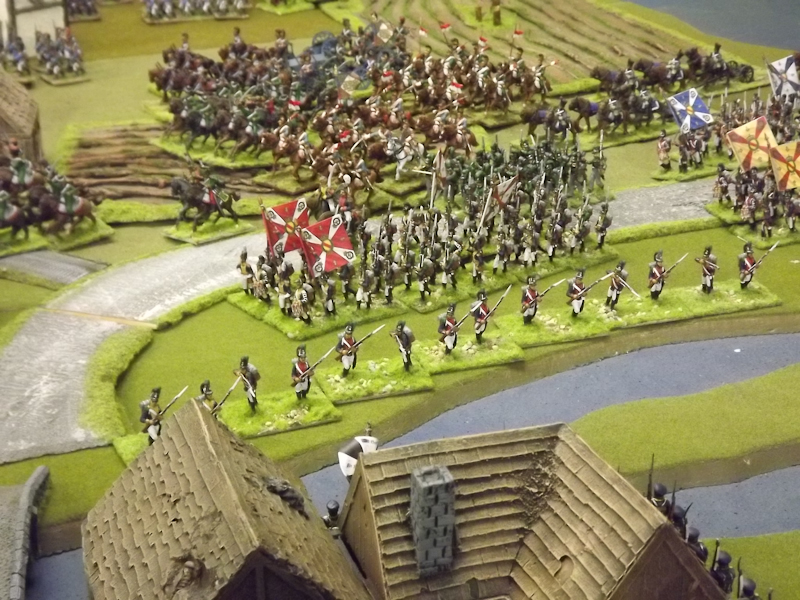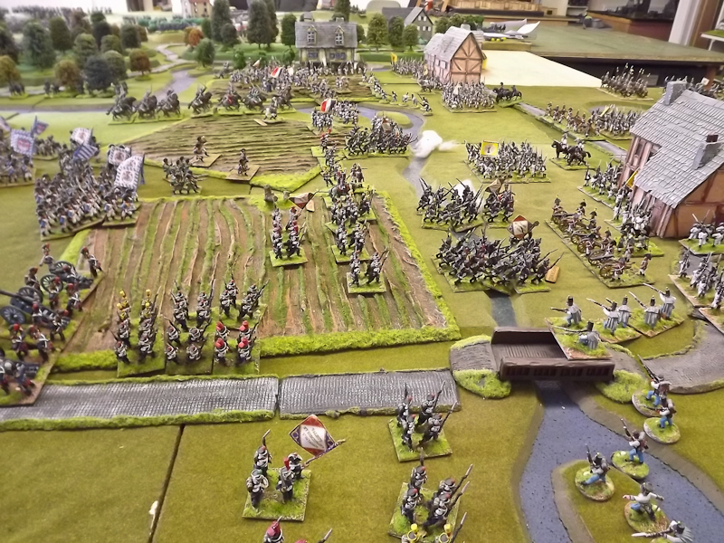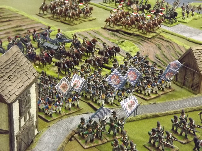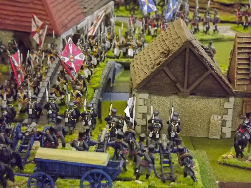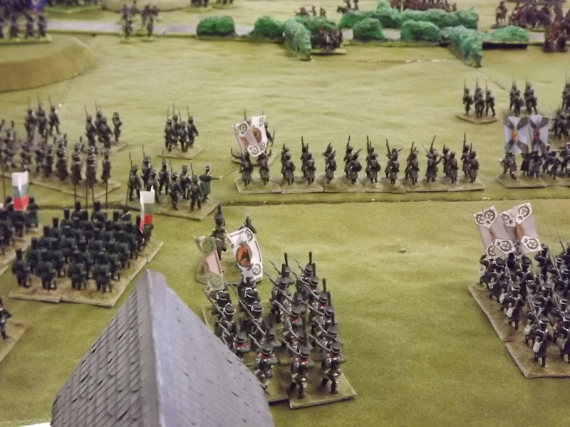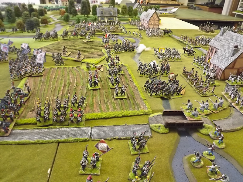 On the right flank Souham’s III Corps is also struggling. Some excellent shooting by the horse artillery attached to Beurmann’s Cavalry Division forced an Austrian battalion out of line but the opportunity to exploit the gap was lost as Brayer’s 8th Division chose that moment to temporarily lose its nerve [as a “Faltering” command due to the loss of a lead unit it failed its Command test – despite an ADC attachment – and rolled “Retire”]. Langeron has almost completed the ordering of his multiple lines of Austrian infantry and is looking confident. The 9th Division under Delmas is heading northeast for Schlauphof and its ford over the Neisse but a gap is opening behind as the 10th and 11th Divisions seem to take turns in failing to advance [one or both are often “Hesitant” and Souham cannot spare the ADCs to give them a re-roll]. The Badeners of Marchand’s 39th Division – originally intended as Souham’s “coup de grace” formation but now diverted to Nieder-Krayn to regain control of the bridge from Yorck’s Prussians – failed in their first assault. This leaves its column stuck on the bridge facing one Prussian Musketeer battalion in garrison to its immediate left flank and another in line to the front supported by a Prussian gun battery [under the scenario it should not have been able to deploy on the wooded escarpment but the Umpire failed to notice until too late; perhaps some of the trees rearranged themselves!]. There is support available from a Baden Foot Battery and skirmishers but it looks as is a battle of attrition will take too long from MacDonald’s point of view.