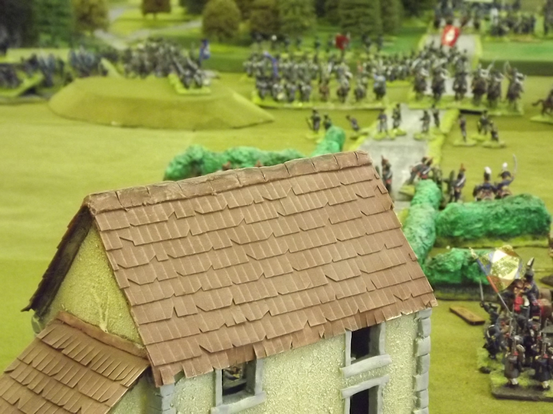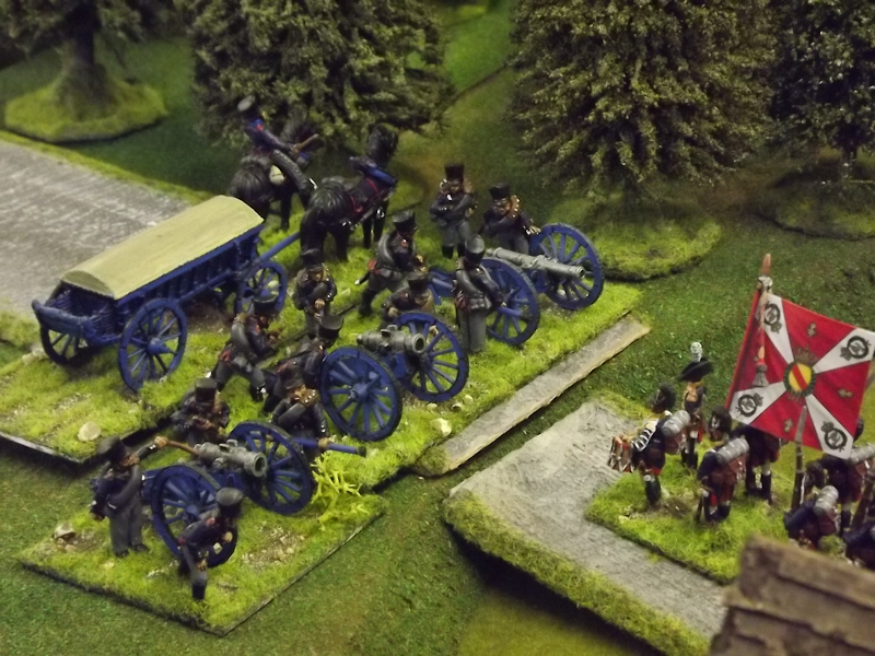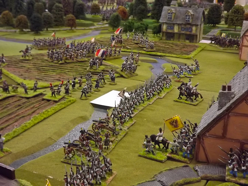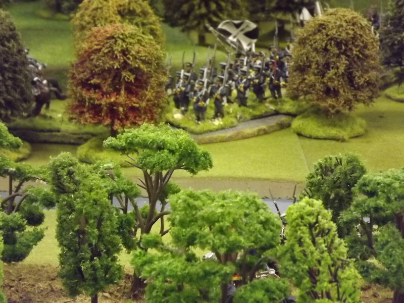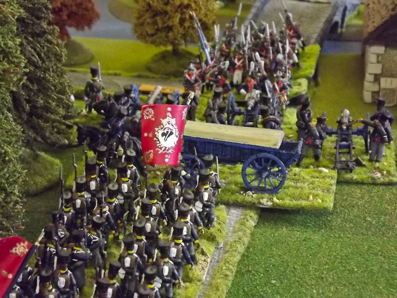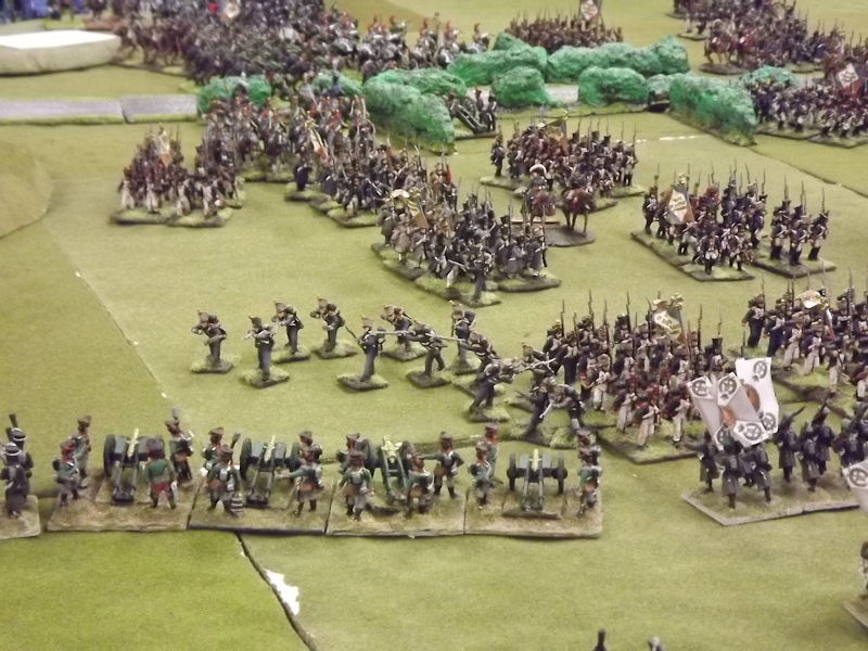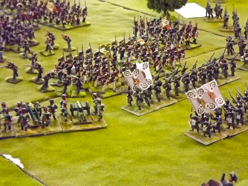 On the right flank Souham’s III Corps is also struggling. Some excellent shooting by the horse artillery attached to Beurmann’s Cavalry Division forced an Austrian battalion out of line but the opportunity to exploit the gap was lost as Brayer’s 8th Division chose that moment to temporarily lose its nerve [as a “Faltering” command due to the loss of a lead unit it failed its Command test – despite an ADC attachment – and rolled “Retire”]. Langeron has almost completed the ordering of his multiple lines of Austrian infantry and is looking confident. The 9th Division under Delmas is heading northeast for Schlauphof and its ford over the Neisse but a gap is opening behind as the 10th and 11th Divisions seem to take turns in failing to advance [one or both are often “Hesitant” and Souham cannot spare the ADCs to give them a re-roll]. The Badeners of Marchand’s 39th Division – originally intended as Souham’s “coup de grace” formation but now diverted to Nieder-Krayn to regain control of the bridge from Yorck’s Prussians – failed in their first assault. This leaves its column stuck on the bridge facing one Prussian Musketeer battalion in garrison to its immediate left flank and another in line to the front supported by a Prussian gun battery [under the scenario it should not have been able to deploy on the wooded escarpment but the Umpire failed to notice until too late; perhaps some of the trees rearranged themselves!]. There is support available from a Baden Foot Battery and skirmishers but it looks as is a battle of attrition will take too long from MacDonald’s point of view.