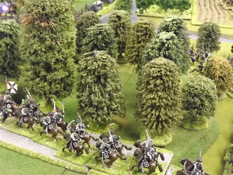 Sébastiani’s II Cavalry Corps laboriously navigated its way along the military road via the bridges at Kroitsch and Nieder-Krayn and up the escarpment on the northern bank of the Neisse to emerge on the plateau with the 2nd Light Cavalry Division and the 2nd Heavy Cavalry Division. Unfortunately, they are still a long way from the left flank of V Corps which is threatened with being overrun by the two Russian Cavalry Divisions. Meanwhile, the 4th Light Cavalry Division, led by the incomparable GdD Exelmans and bringing up the rear of II Cavalry Corps, has encountered Prussian Hussars from Yorck’s Corps advancing from the bridge at Schlaupe, both sides strong out in march column along the wooded roads.