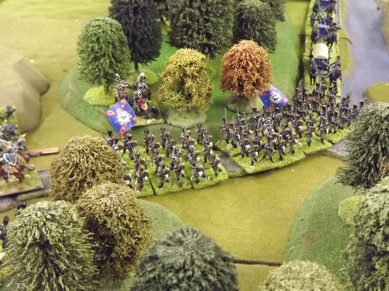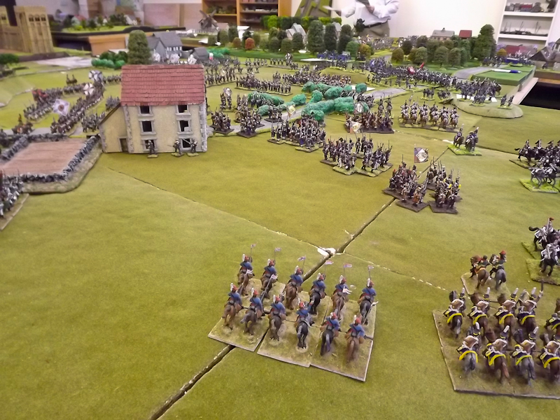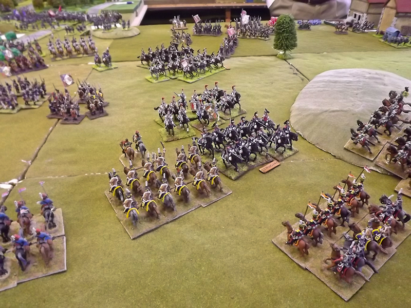 The rest of Sébastiani’s II Cavalry Corps – the 2nd Light Cavalry Division and the 4th Light Cavalry Division – were facing a nightmare of command-and-control in the confined space of the escarpment along the northern bank of the Neisse. The 2nd Light Cavalry had successfully made its way through the wooded defiles on to the plateau only to find their path blocked by Rochambeau’s 18th Infantry Division advancing across their path, whilst behind them Prussian Fusilier battalions were skirmishing in the woods and bring the stationary cavalry under a galling fire which they could do nothing about. Finally, half the division chanced its arm on feeding through a gap on Rochambeau’s right flank, only to fail to over-run an exposed Russian gun battery in a flank charge (the fifth or sixth time the Russians rolled 11 or 12 in a Charge Test that morning…). The 4th Light Cavalry Division fared even worse; stuck on the roads leading up from the Nieder-Krayn bridge they encountered Yorck’s Prussian Hussars under General Jürgass also in march column on the narrow valley road: round one went to the Lanciers du Ligne; round two to the Prussians, sending Exelman’s command reeling back across the Neisse and allowing Yorck’s Prussian foot to continue their remorseless advance right between the two wings of the French Army. MacDonald had clearly lost control of the battle, hampered by the terrain and some shocking lapses in command [French die rolling on the left flank was almost epically poor: 2 or 3 rolled in Charge or Discipline Test after Charge or Discipline Test].