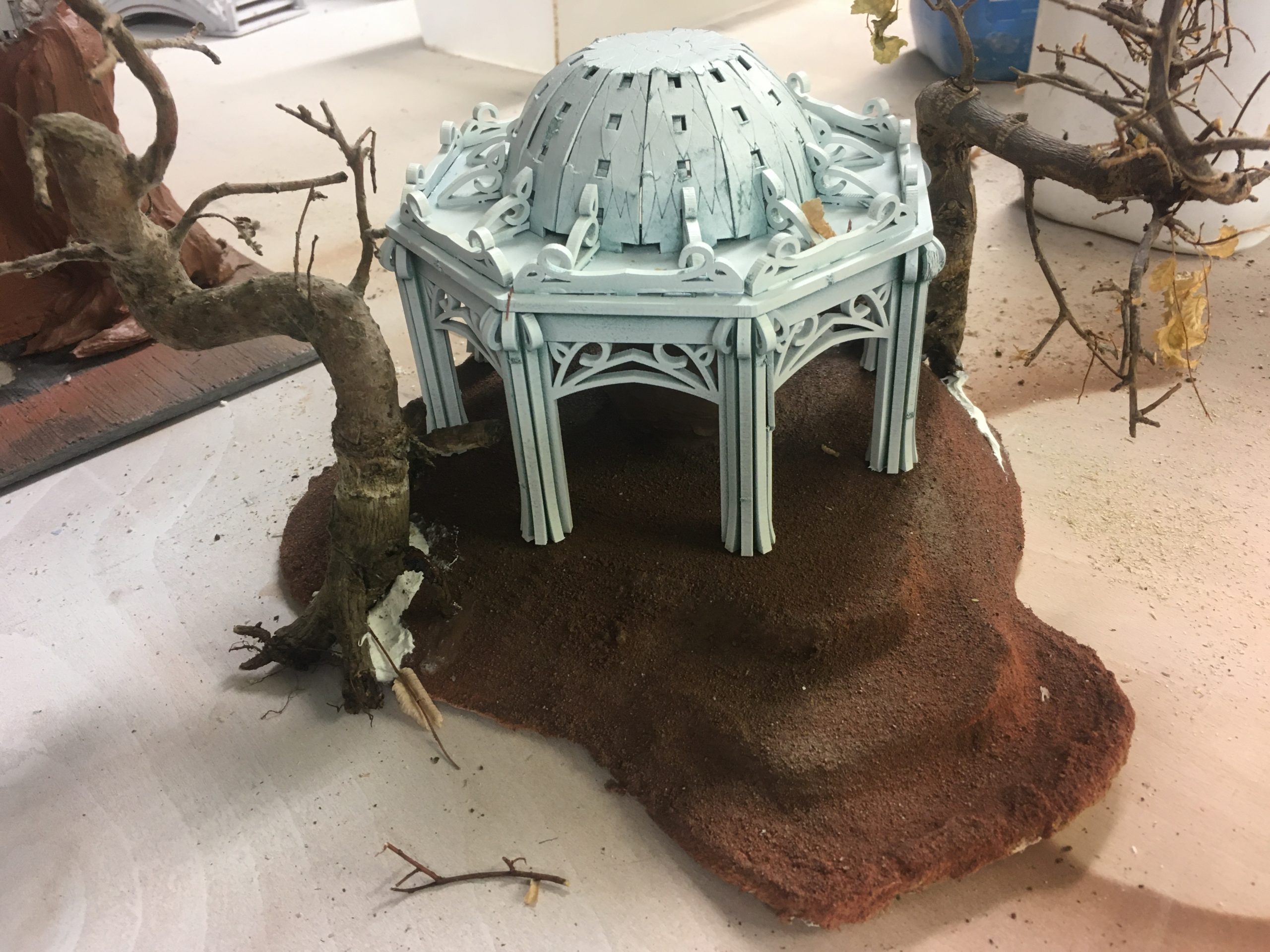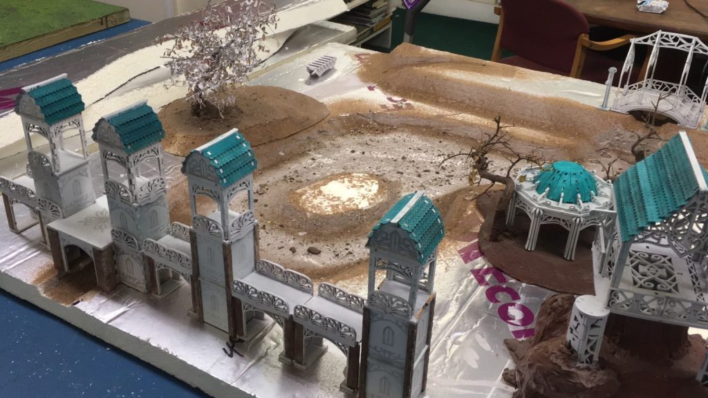 We chose white for the buildings and picked out detail out in silver and gold with wooden beams where visible The large doors we painted brass. For the roofs we went for a turquoise and for the floors we went for tile effect sheet with a brown wash and fixed this to the walkways.