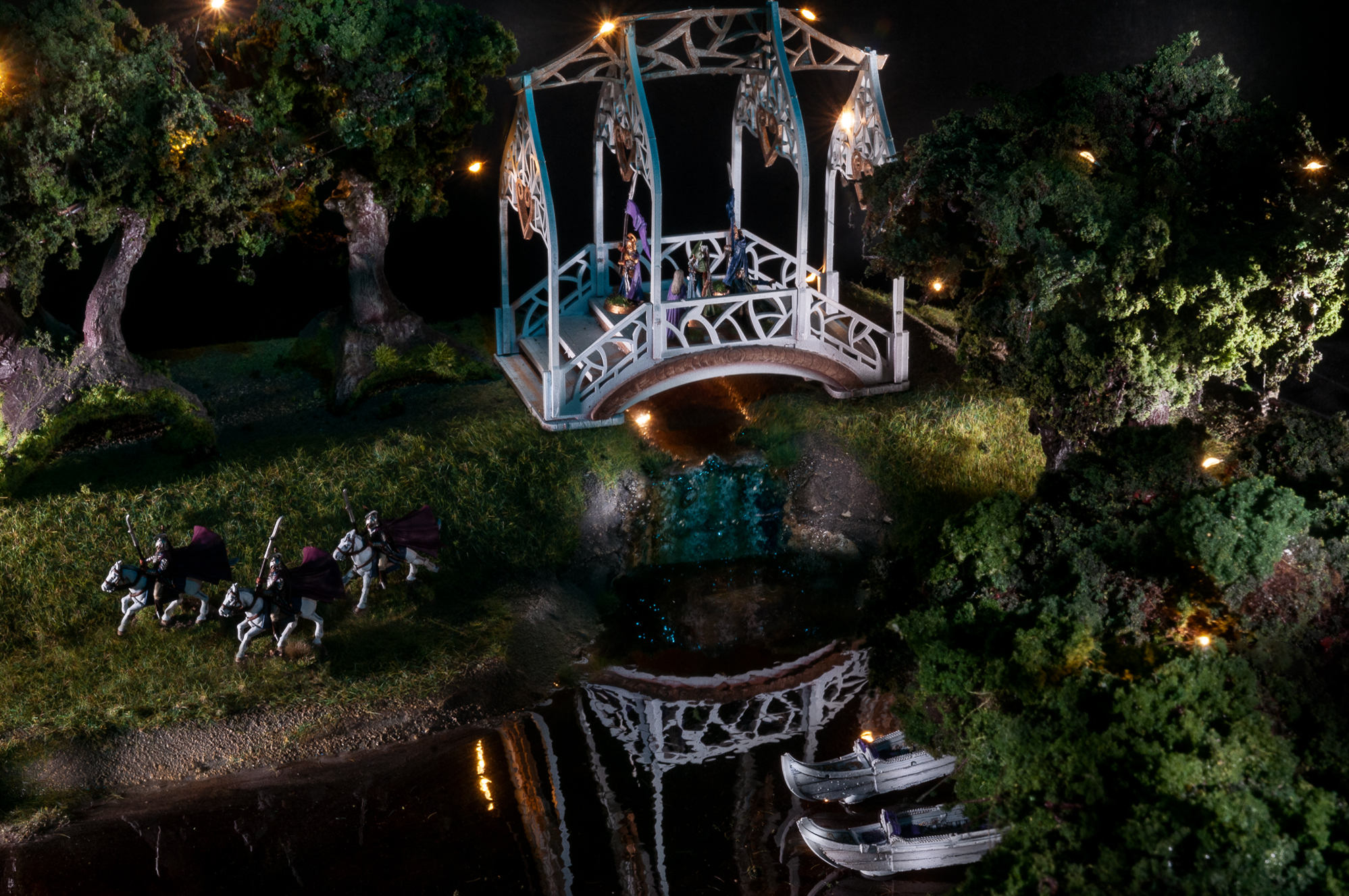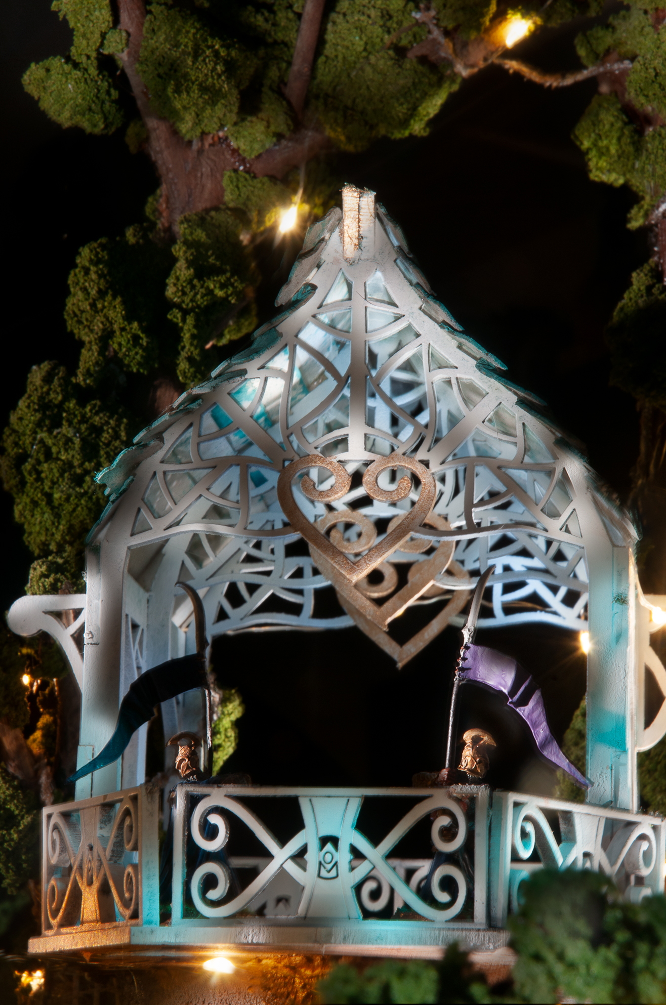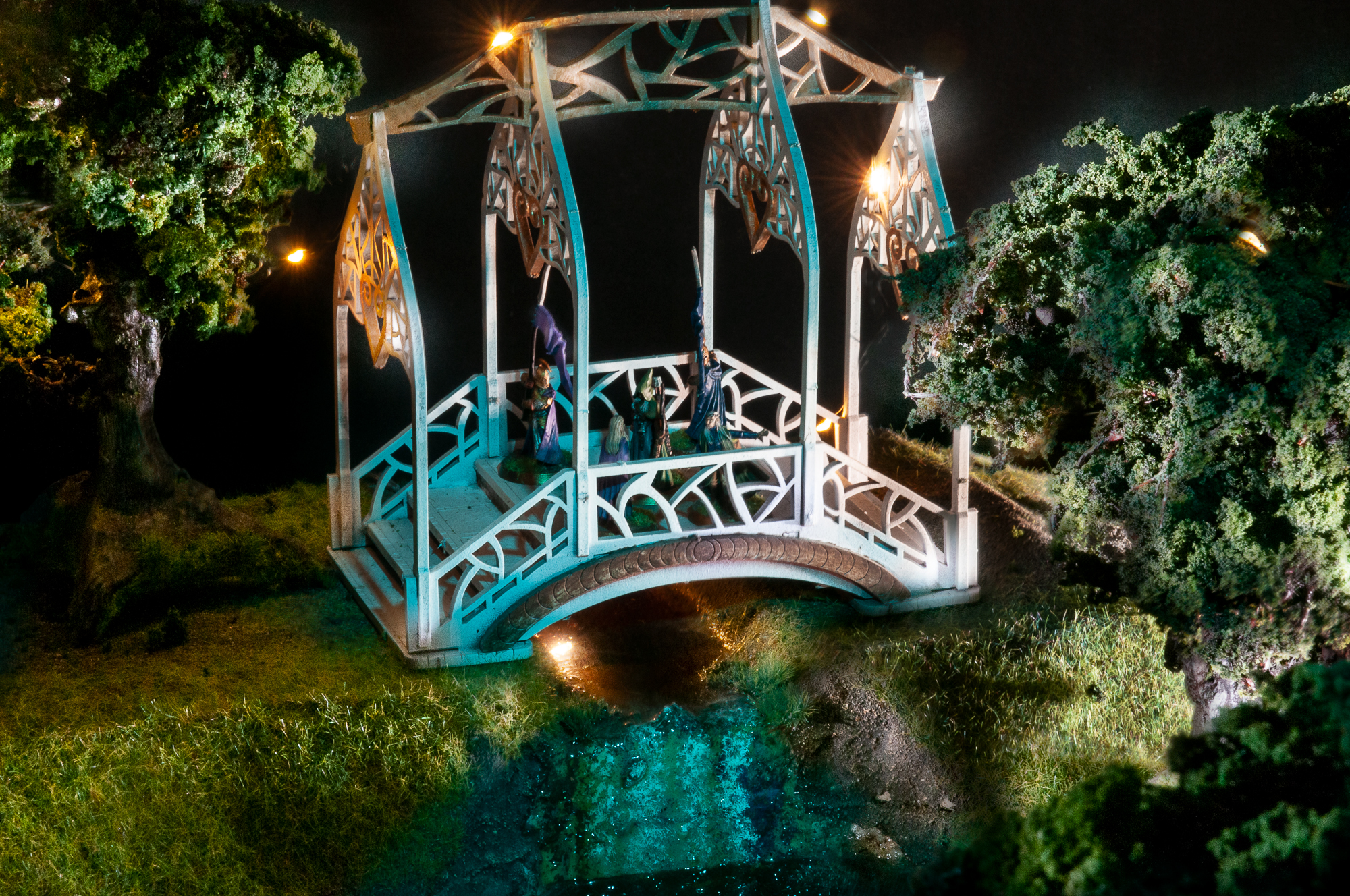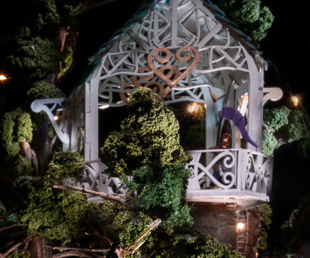 I chose trees that looked particularly old and just so happens these particular trees were built about 25 years ago.  I strung 2 sets of lights in the trees and where the cable was visible it was cloned out in photoshop.
