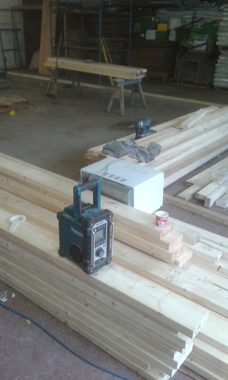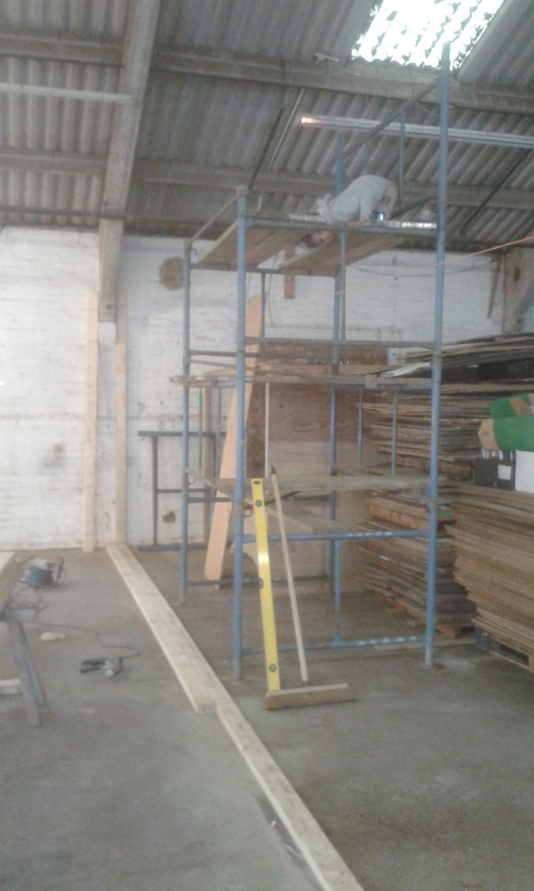 Closer view of the Workshop with the ceiling joists going in, leaving a loft hatch for storage.